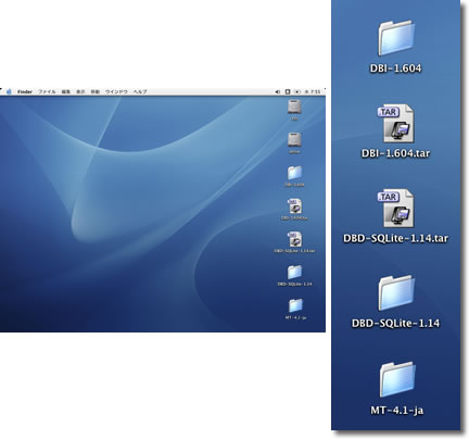 - DBD-SQLiteは、データベースを関連づける機能がある(らしい)。http://search.cpan.org/dist/DBD-SQLite/からダウンロードし、解凍。解凍して生成されたフォルダはデスクトッップにおいたままにする。